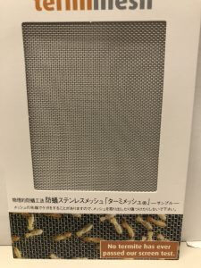 約0.2mmステンレス製の指定部材、ステンレスメッシュを使います。1mm以下であればシロアリが通過出来ず、分泌物にも腐食しない、錆びにくい耐久性もある、家屋の様に様々な設計に対応出来る柔軟性もあります。これは物理的防御なので環境汚染はありません。但し、施工に技術が必要な上、施工時間は薬剤による化学的防御より掛かります。この技術はレベル0から始まりレベル4までの講習を要します。