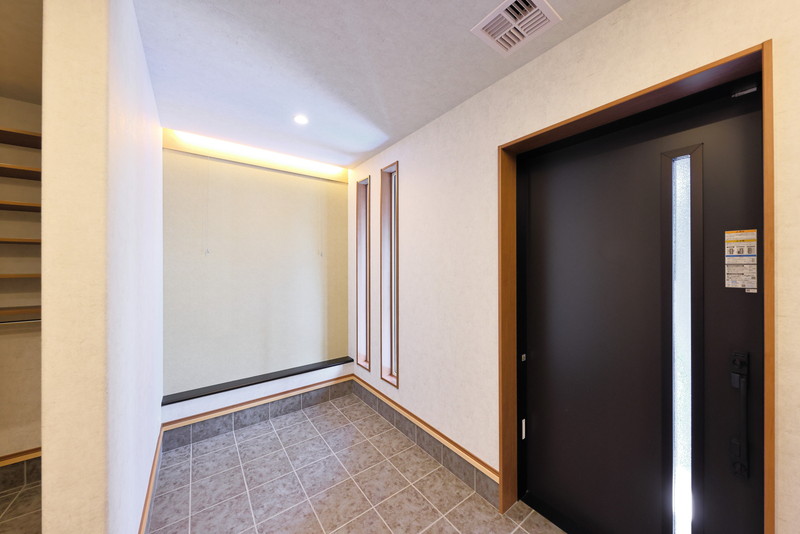 織部床風ニッチのある玄関。掛け軸を簡単に飾れるよう、ピクチャーレールを取り付けました。