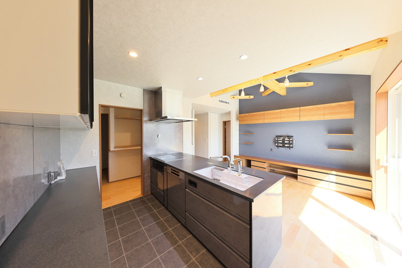 モノトーンでまとめたキッチン。床は水に強いタイルで仕上げました。