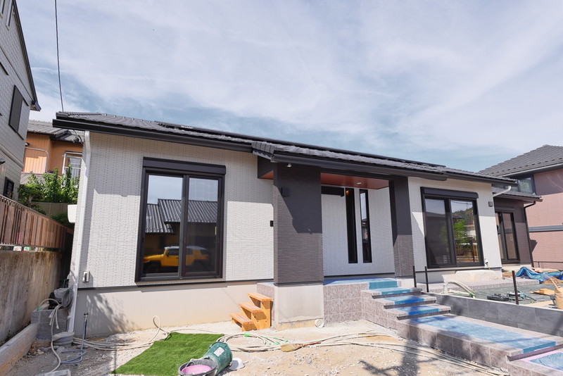 外壁をタイルで仕上げ、重厚感ある平屋の外観となりました。